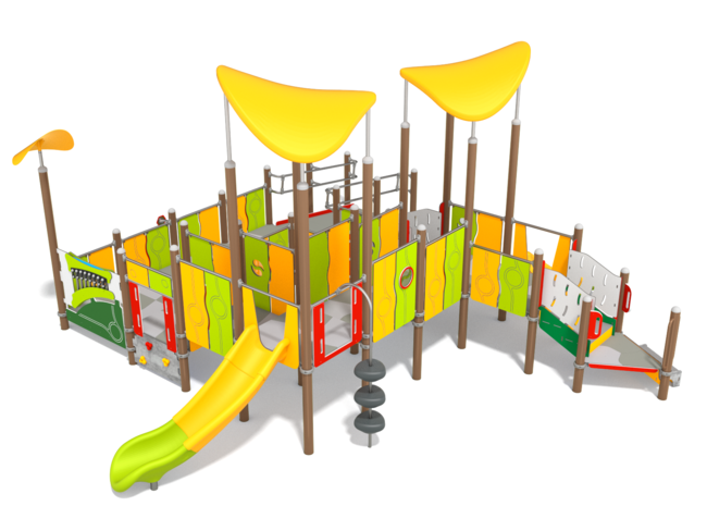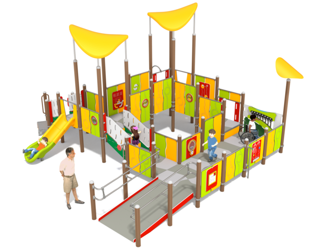 Structure PMRDisques à grimperRampe d'accésEscalier transfertmarche d'accèsMur d'escaladePanneaux ludiquesPanneaux musicauxHaut parleurToboggan rotomoulé