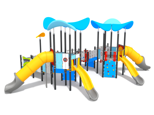 Structure PMRRampe d'accésBarre de pompierEscalier transfertFilet de grimpeHaut parleurMur d'escaladePanneaux ludiquesToboggan rotomouléToboggan tunnel rotomoulé