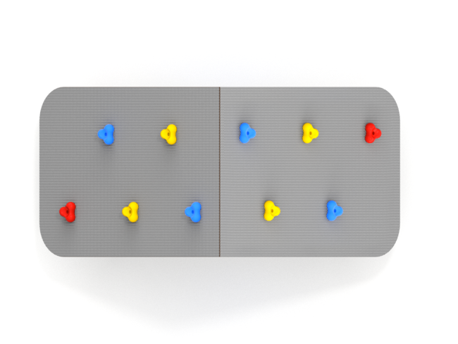 Prises d'escalades coloris, vert bleu, jaune, rouge, en résine polyester.