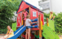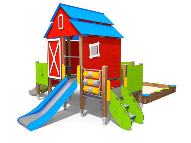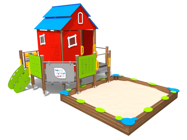 CabaneComptoirEscalierJeux de sablePanneaux ludiquesMur d'escaladeToboggan polyester