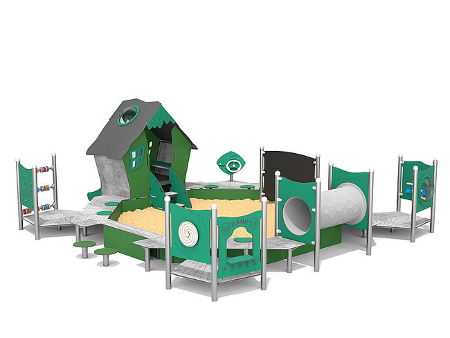 Jeux de sableCabaneComptoirEscalierPanneaux ludiquesTobogganTunnel