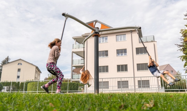 Siège de balançoire pendulaire en caoutchouc souple renforcé d'une plaque d'acier, chaine galvanisée gainée.