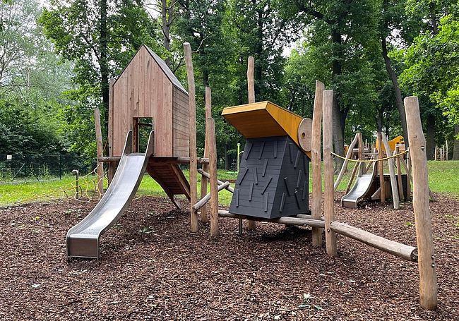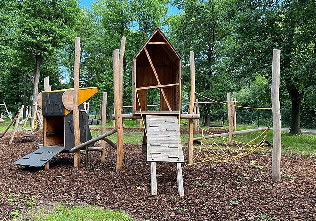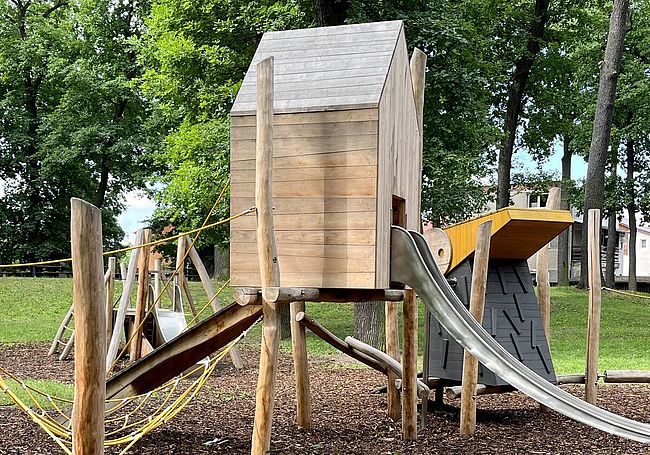 Jeux à thèmeCabaneFilet hamacHaut parleurPlan incliné d'escaladePoutre d'équilibre