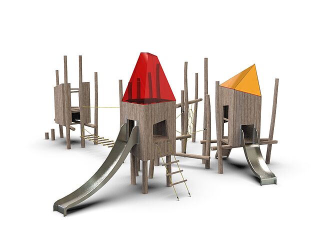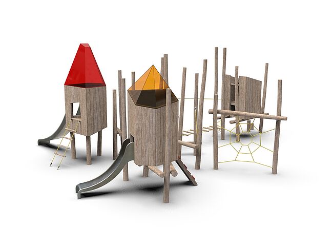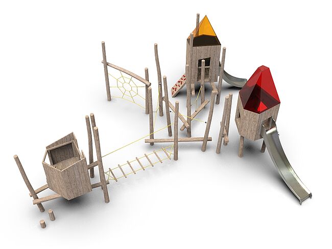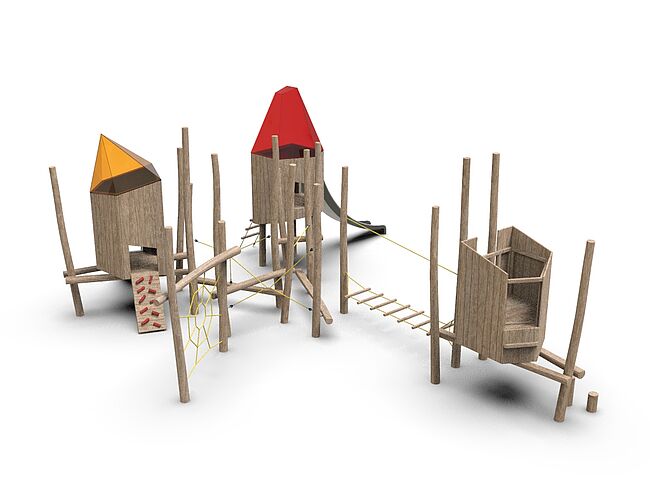 CabaneEchelle d'accèsEchelle de cordeFilet de grimpePlan incliné d'escaladePont filetPoutre d'équilibreToboggan