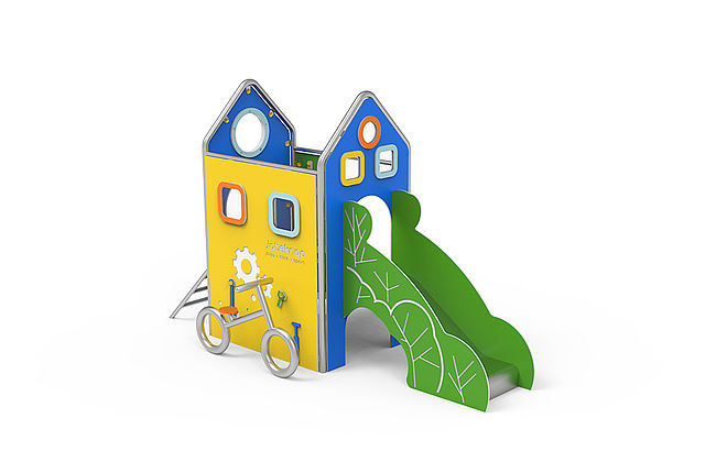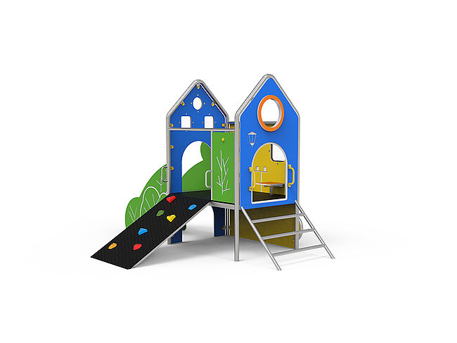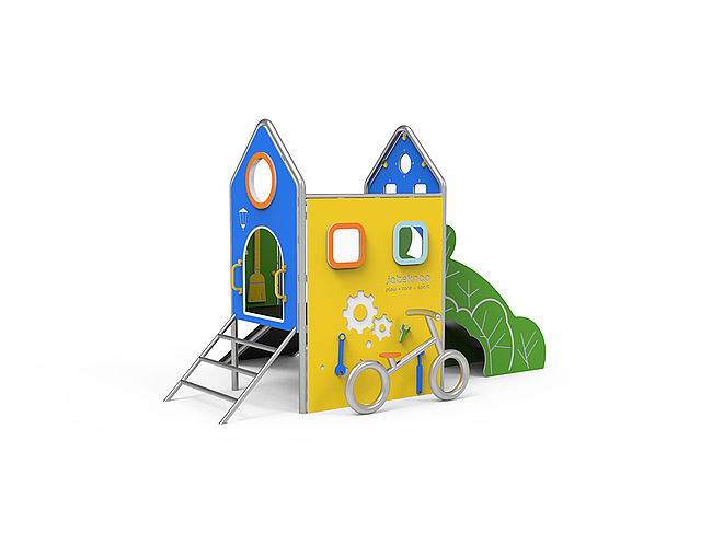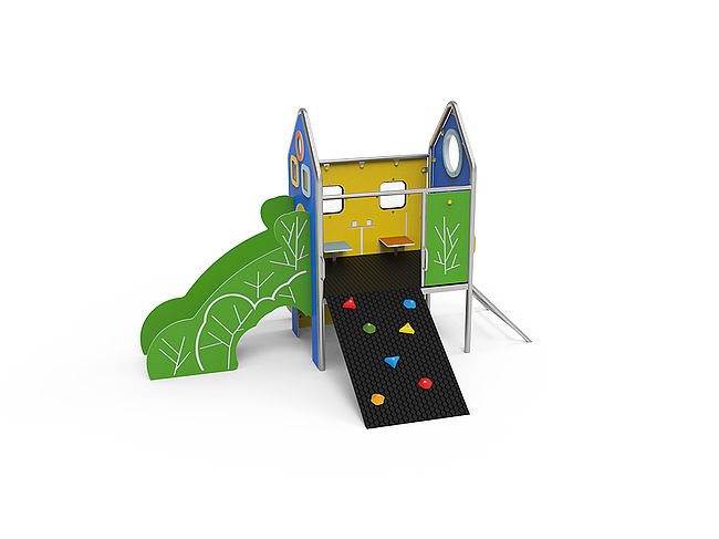 CabaneBancsEchelle d'accèsPanneaux ludiquesPlan incliné d'escaladeToboggan