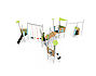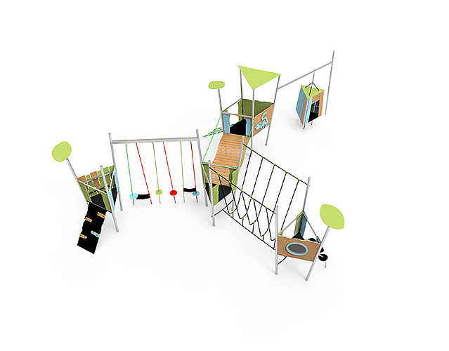 CabaneDisques à grimperFilet de grimpePanneaux ludiquesPlan incliné d'escaladePont fixePont filetPas de géants