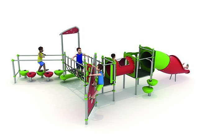 Structure d'équilibreStructure de grimpeDisques à grimperEchelle d'accèsmarche d'accèsMur d'escaladePont filetPas de géantsTunnelToboggan tunnel