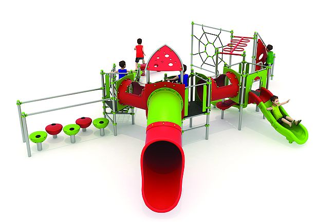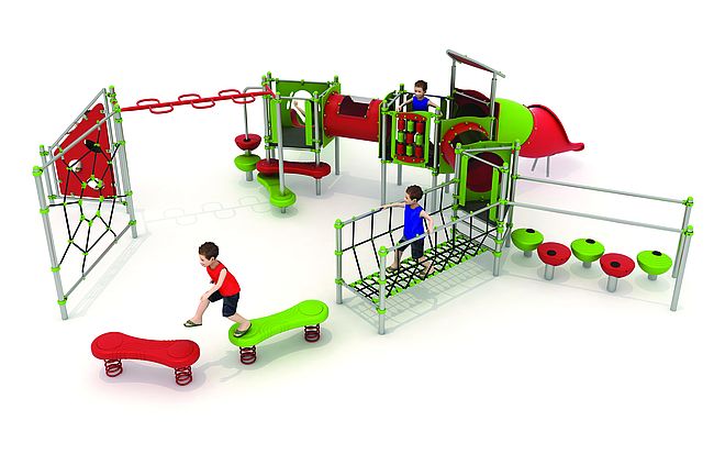 Banc ressortDisques à grimperEchelle horizontaleFilet araignéemarche d'accèsMur d'escaladePont filetPas de géantsTunnelToboggan rotomouléToboggan tunnel