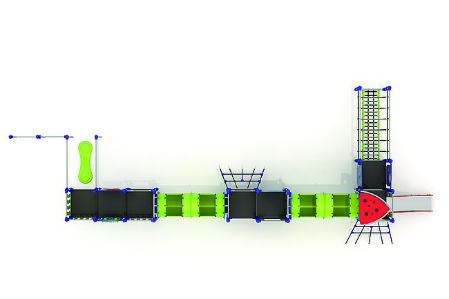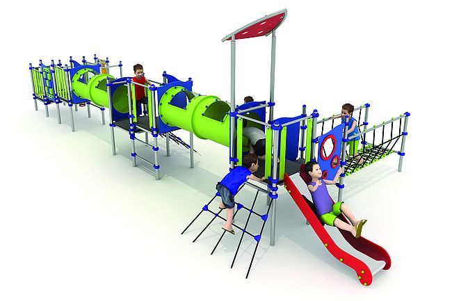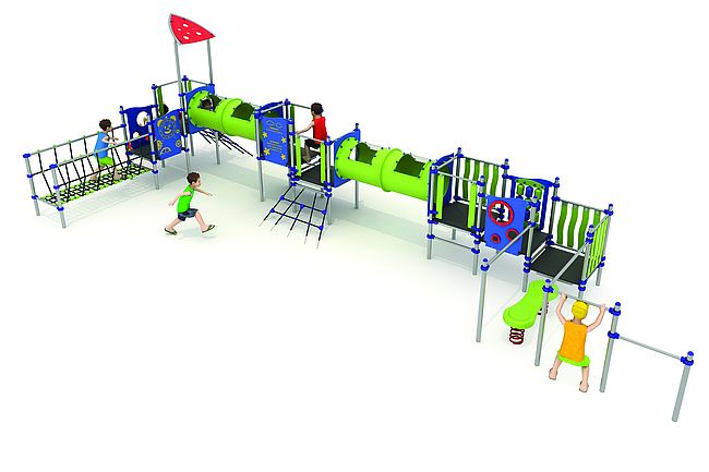 Banc ressortBarre fixeEchelle d'accèsFilet de grimpePanneaux ludiquesPont filetTunnelToboggan