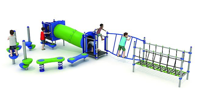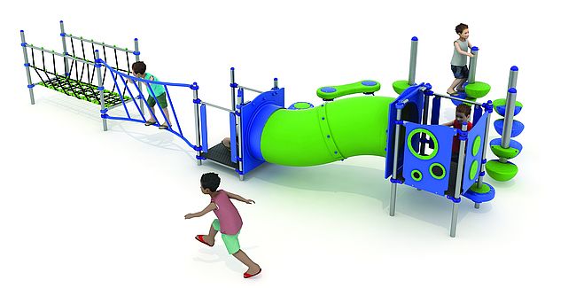 Structure d'équilibreStructure de grimpeBanc ressortBanc rotomoulémarche d'accèsMur d'escaladePont filetTunnelDisques à grimper