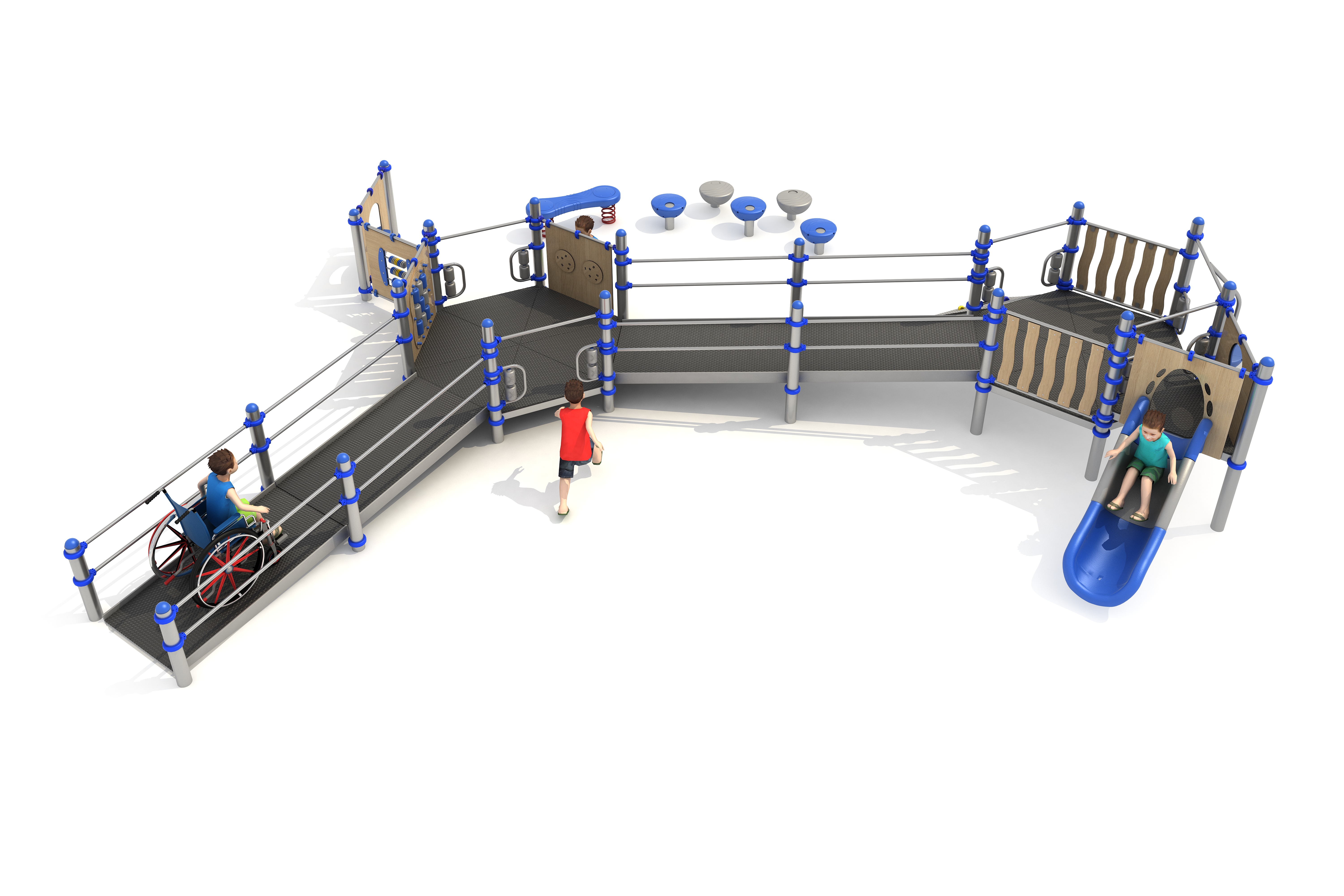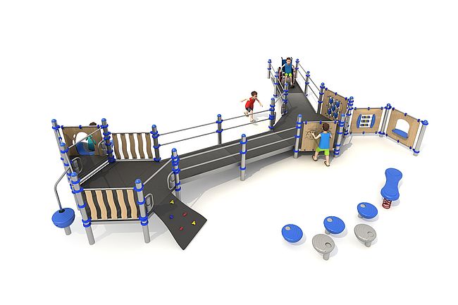 Structure PMRBanc ressortComptoirDisques à grimperPanneaux ludiquesPlan incliné d'escaladePas de géantsRampe d'accésToboggan rotomoulé