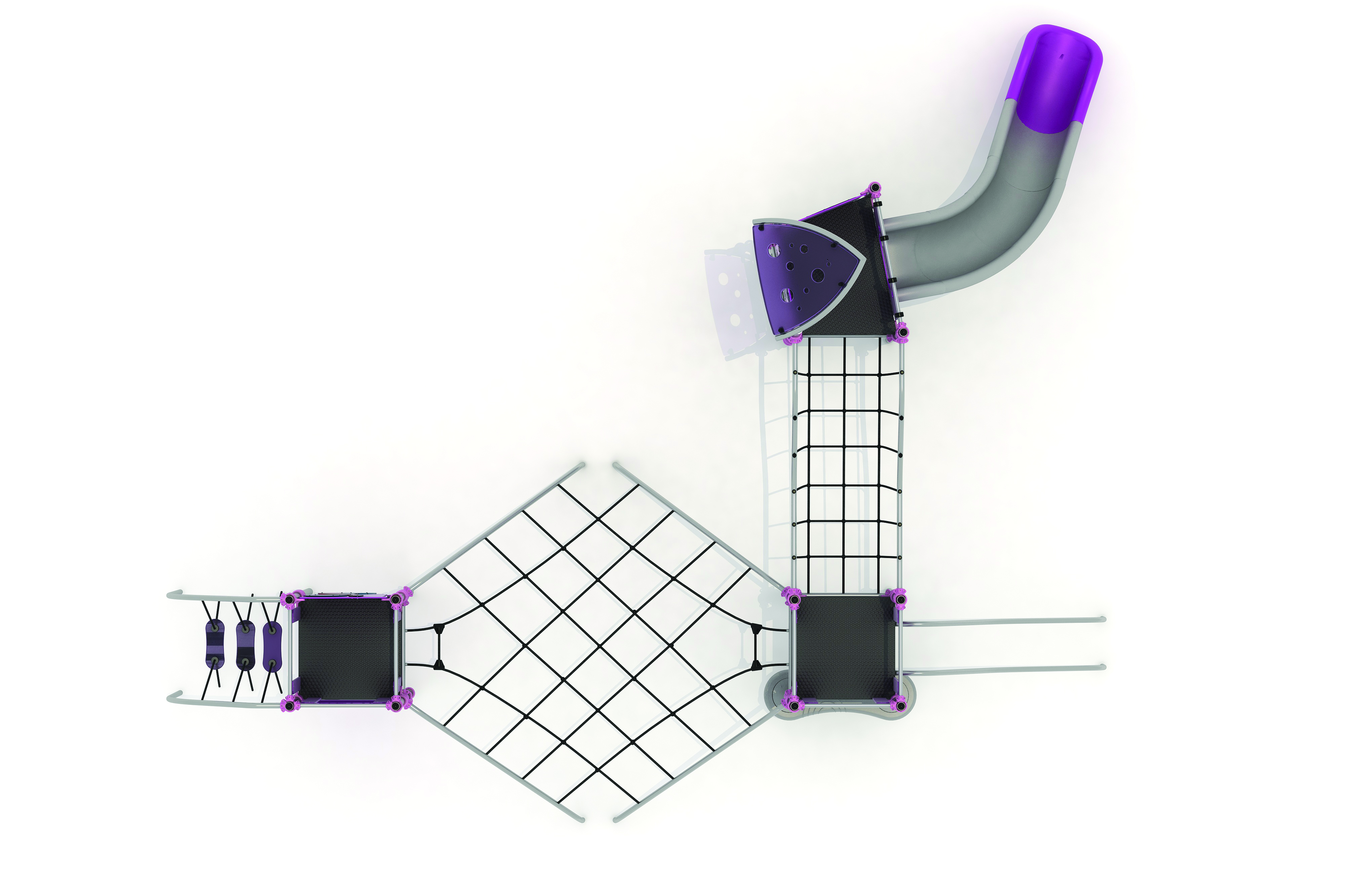 Barre de glisseEchelle de cordeFilet de grimpemarche d'accèsPanneaux ludiquesMur d'escaladePont filetPont obliqueToboggan rotomoulé