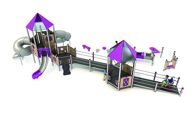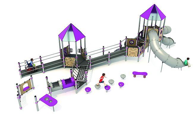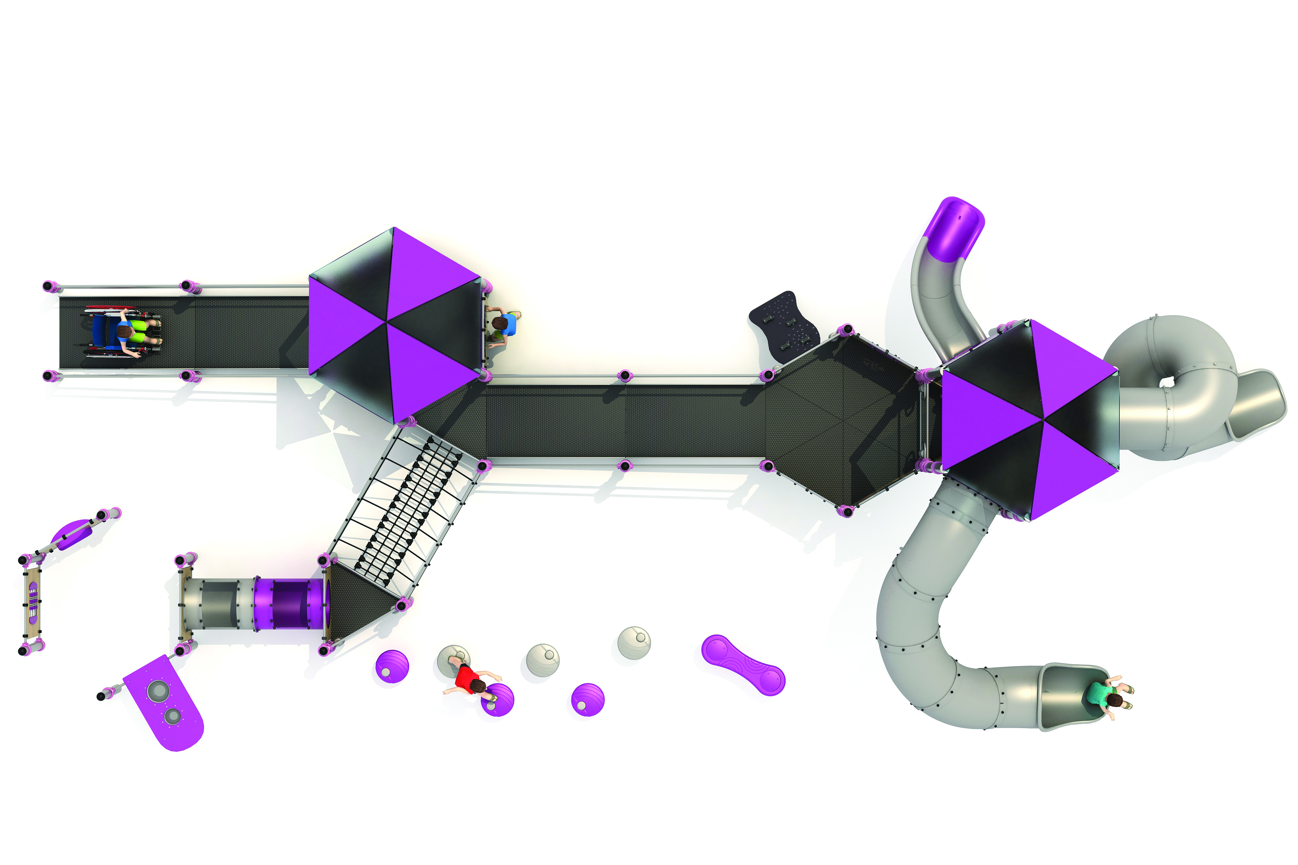 Structure PMRBanc ressortComptoirPanneaux ludiquesPas de géantsPlan incliné d'escaladePont filetRampe d'accésTunnelToboggan rotomouléToboggan tunnel rotomoulé