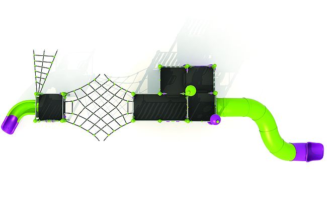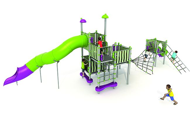 Echelle obliquemarche d'accèsFilet de grimpePanneaux ludiquesPont filetToboggan spirale rotomouléToboggan tunnel rotomoulé
