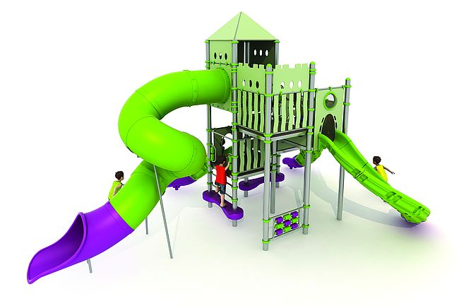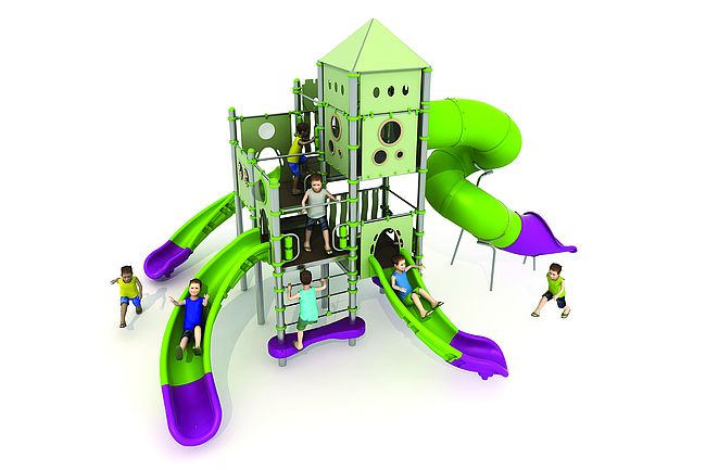 Structure géanteEchelle d'accèsFilet de grimpemarche d'accèsPanneaux ludiquesToboggan spirale rotomouléToboggan tunnel rotomoulé