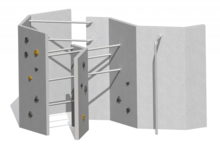 Tubes, bandes et plates-formes en acier inoxydable et parois en contreplaqué texturé résistant aux intempéries et à l'usure, imitant l'aspect du béton.